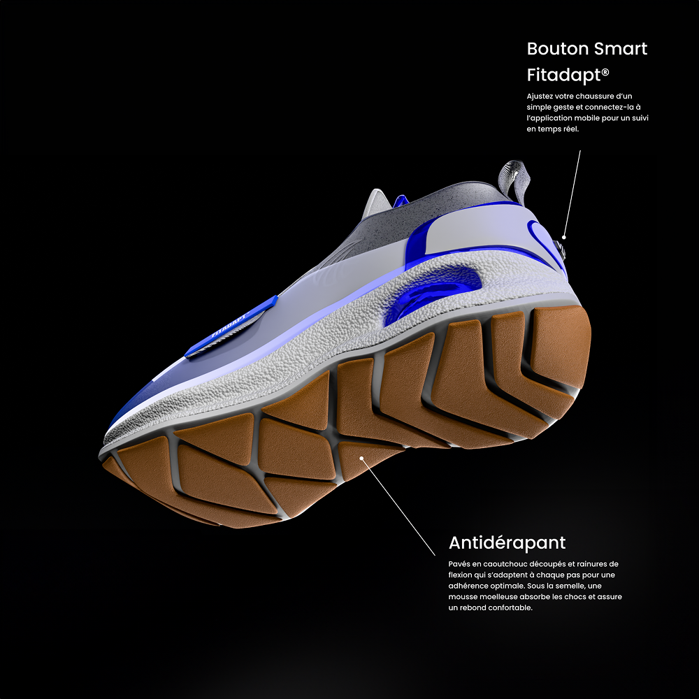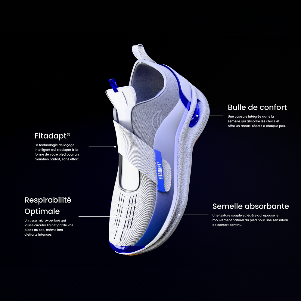 FitAdapt détecte l’espace autour du pied à l’enfilage, puis ajuste la pression grâce à un moteur et un système d’engrenage. Pendant le jeu, vous pouvez desserrer au temps mort et resserrer à la reprise — au contact sur la chaussure ou via l’app. Des mises à jour du micrologiciel améliorent régulièrement la précision.